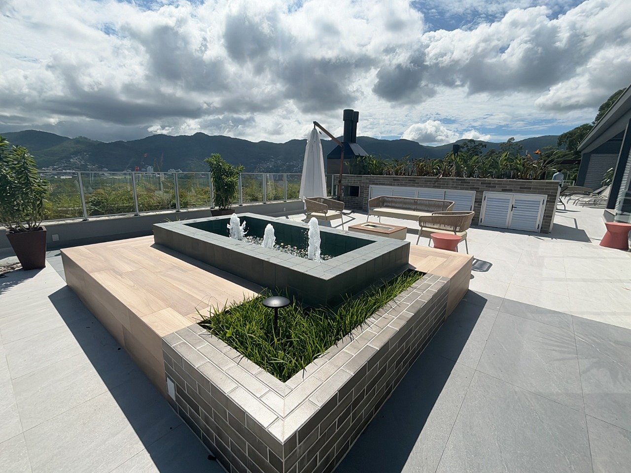 - Sacada com acabamento moderno e guarda-corpo em vidro