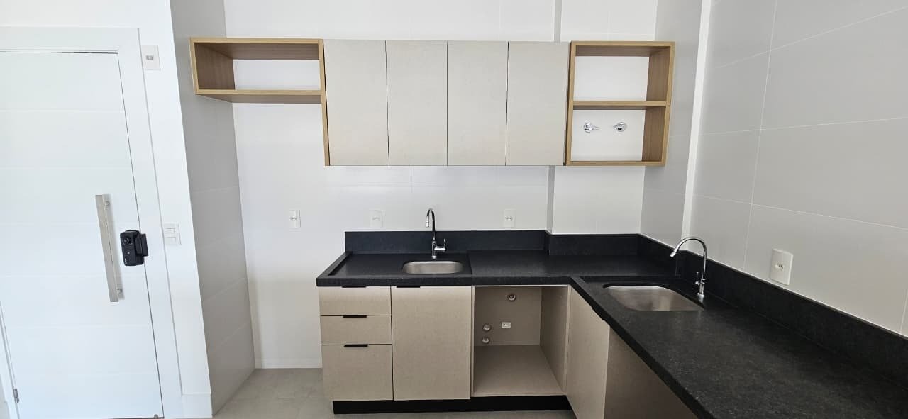Estúdio mobiliado no Saco Grande, com sacada e 1 vaga. Ambientes bem aproveitados, ar condicionado e porcelanato. Condomínio com piscinas, academia, coworking e espaço gourmet. Região valorizada, com acesso rápido às praias e universidades.