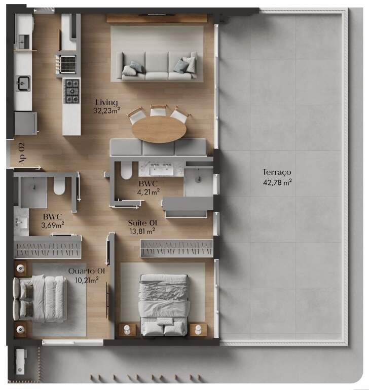 - Apartamento garden de 2 quartos (1 suíte) e banheiro social com 123,79m² privativos (sendo 81,01m² internos e 42,78m² de terraço)