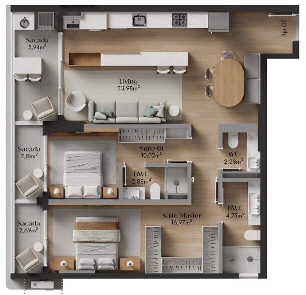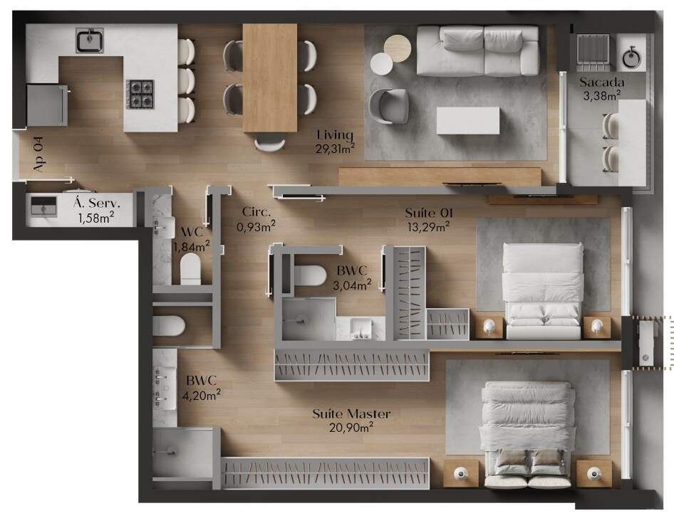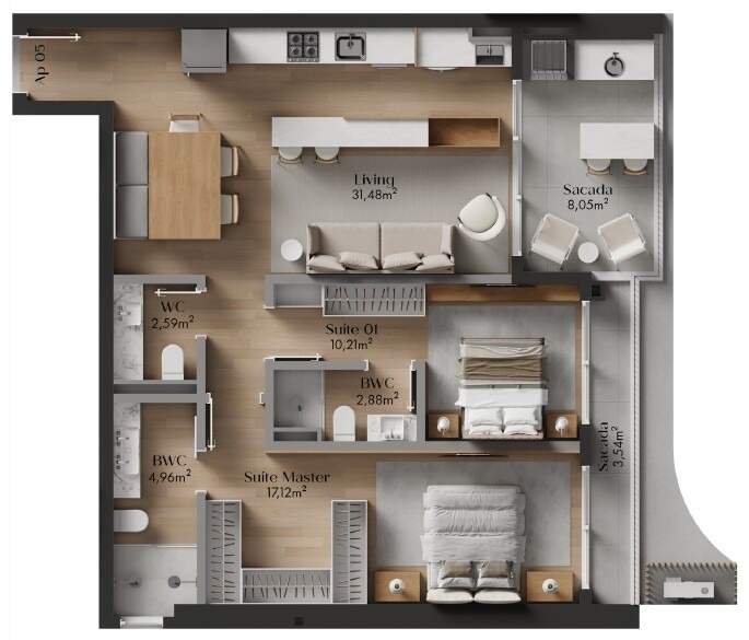 - Piso vinílico (cozinha, área de serviço, área social/circulação, dormitórios, banheiros e lavabos) e porcelanato (sacada e box dos banheiros)