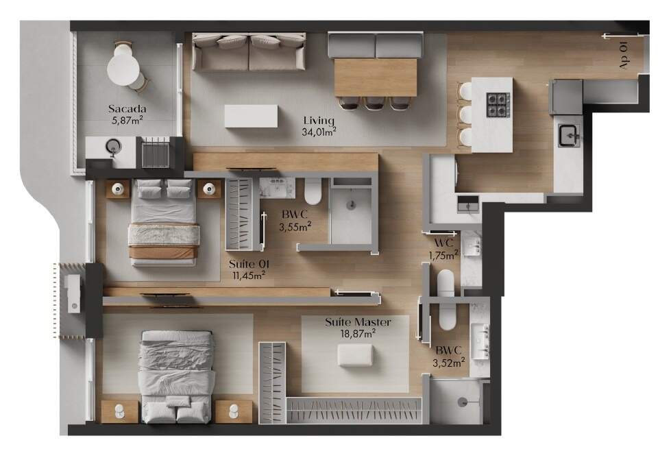- Apartamentos de 2 suítes e lavabo de 82,10m² a 96,34m² privativos