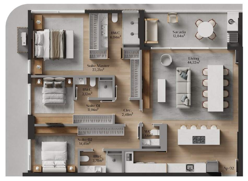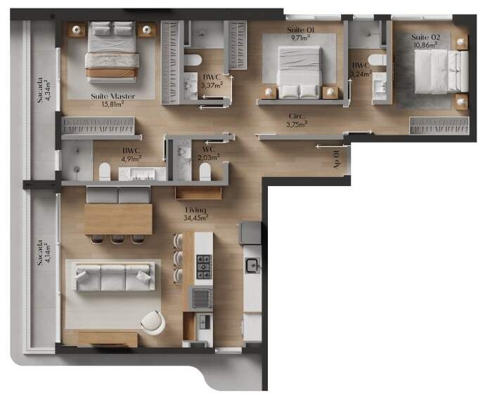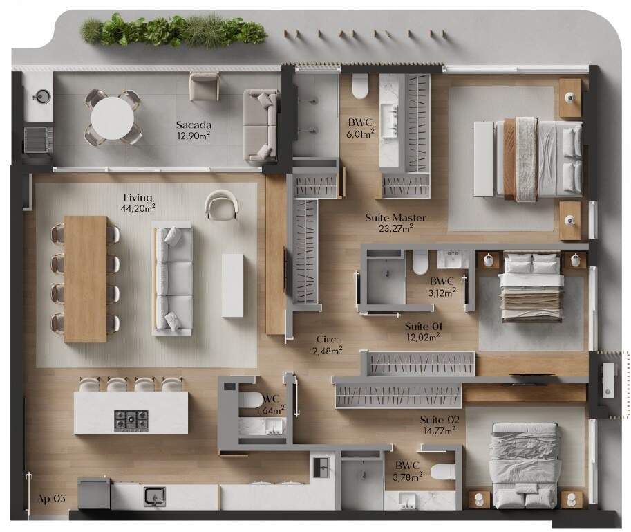 - Apartamentos de 3 suítes e lavabo de 119,95m² a 146,32m² privativos
