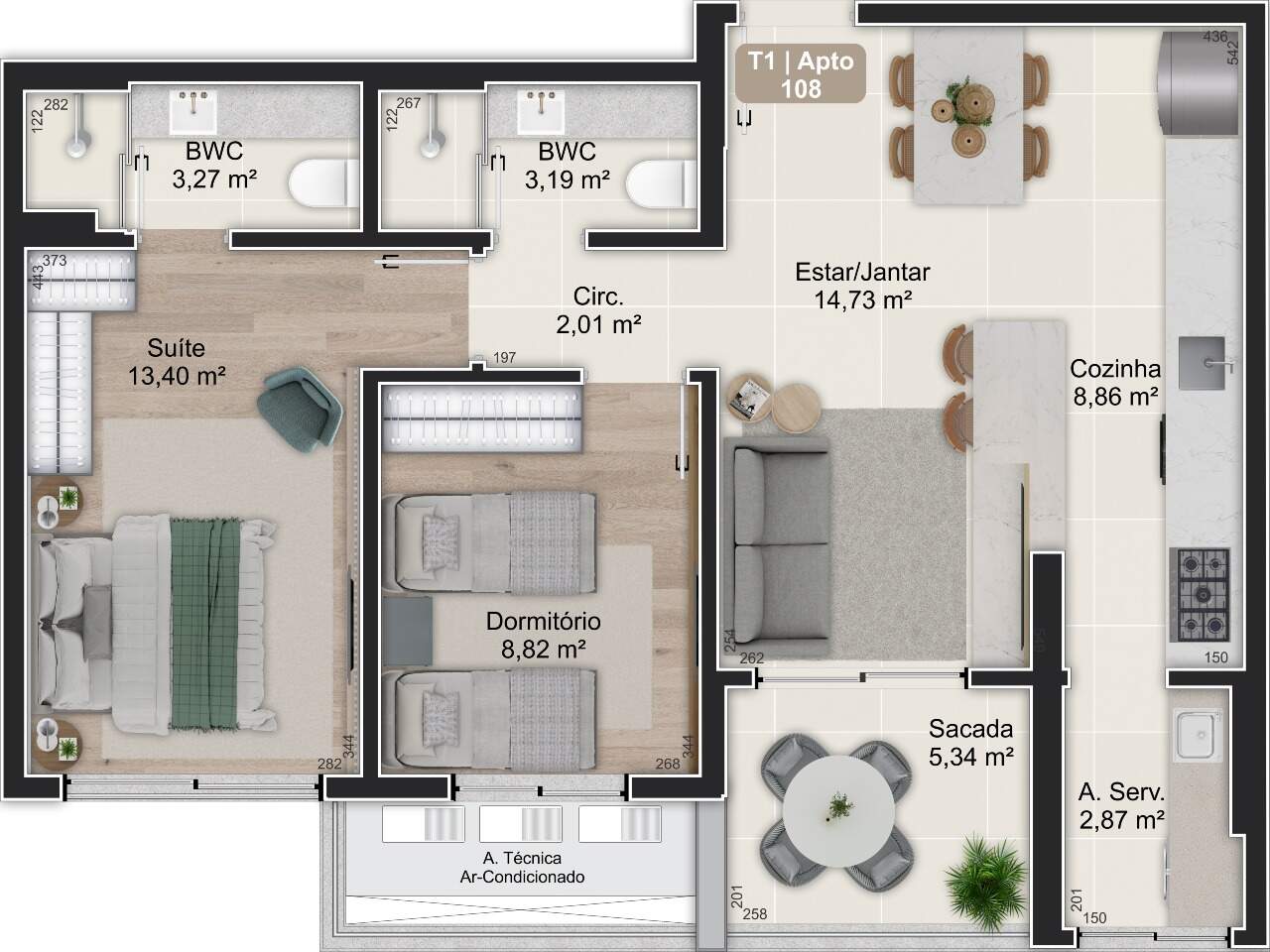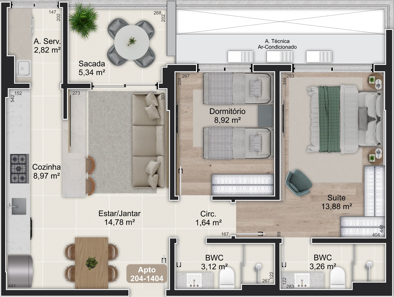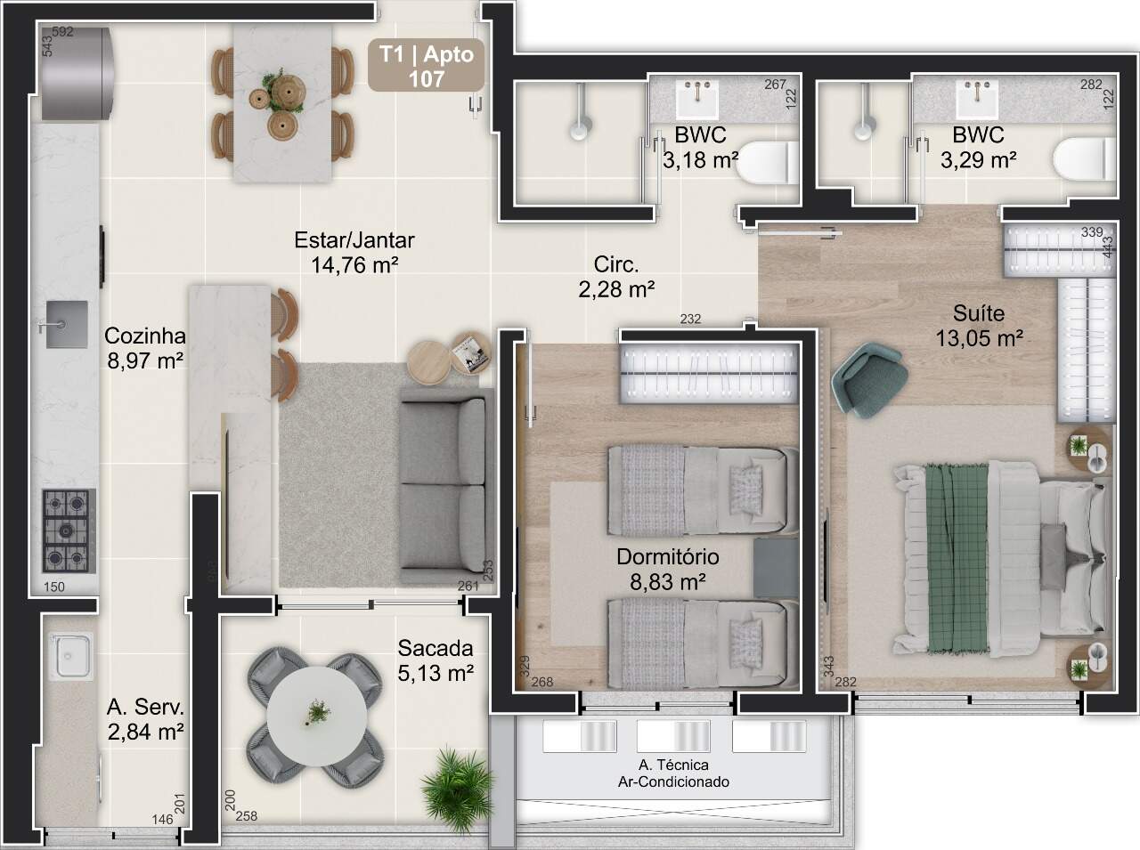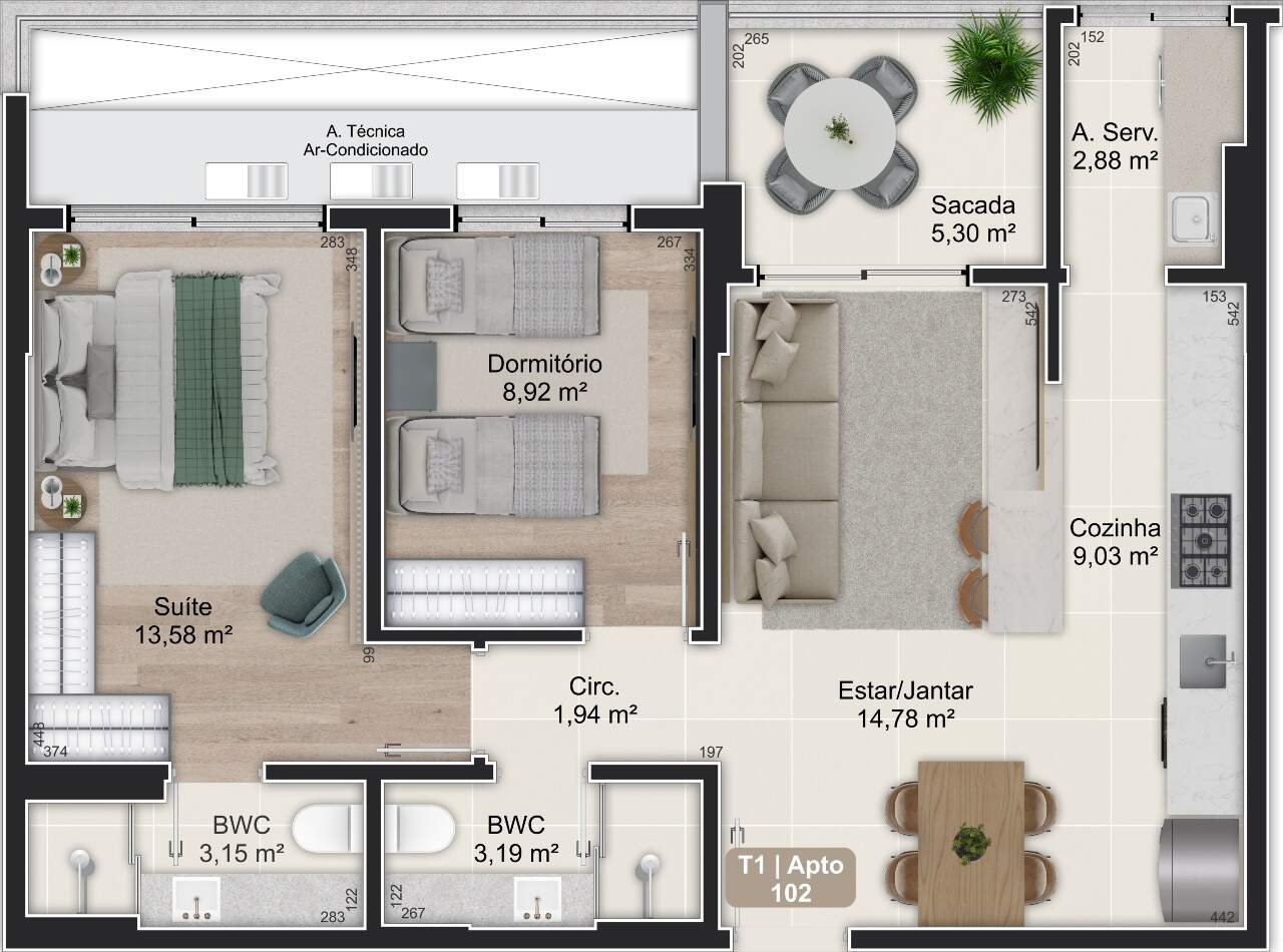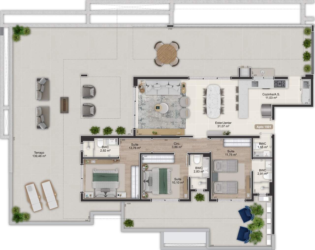 - Áreas privativas de 47,98m² a 136,09m²