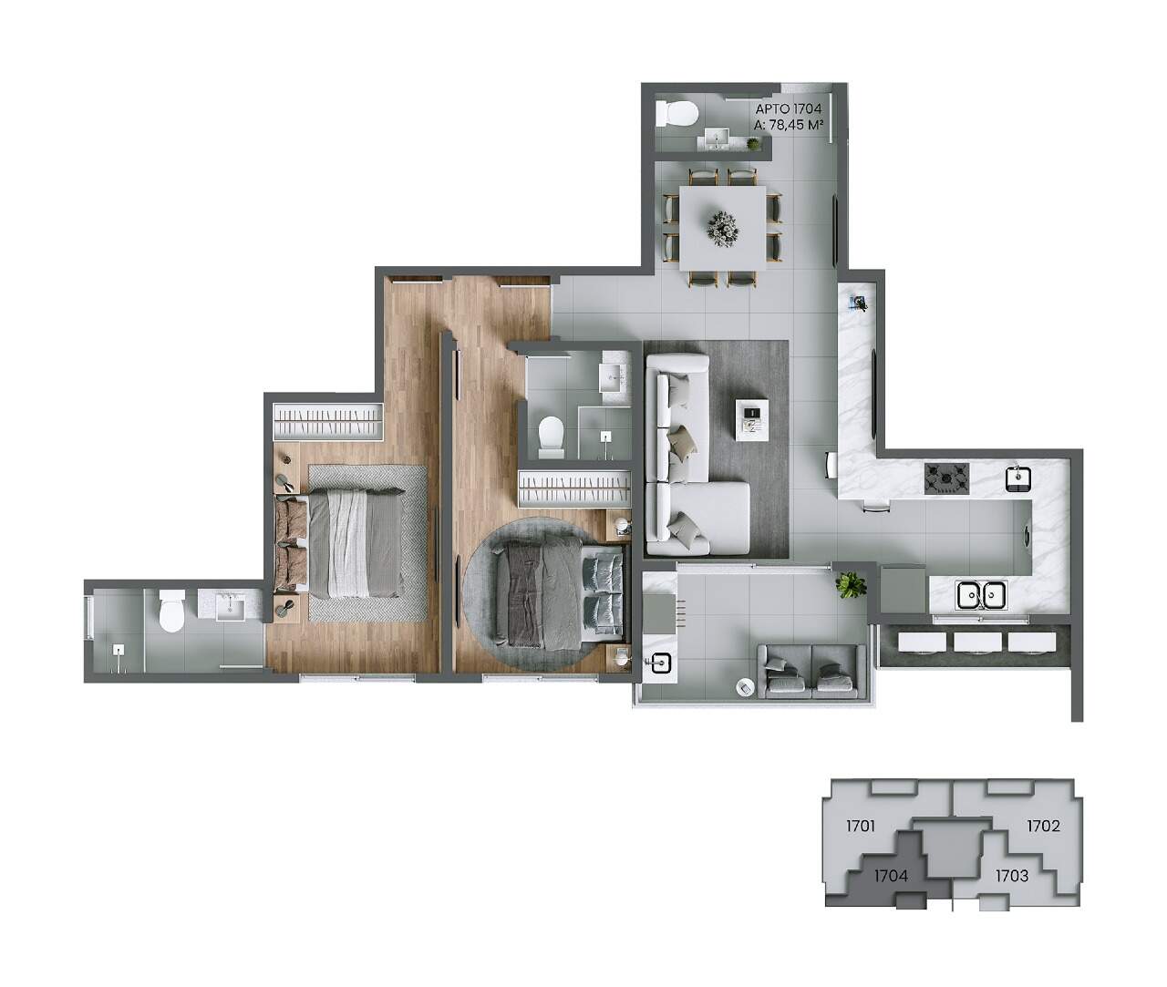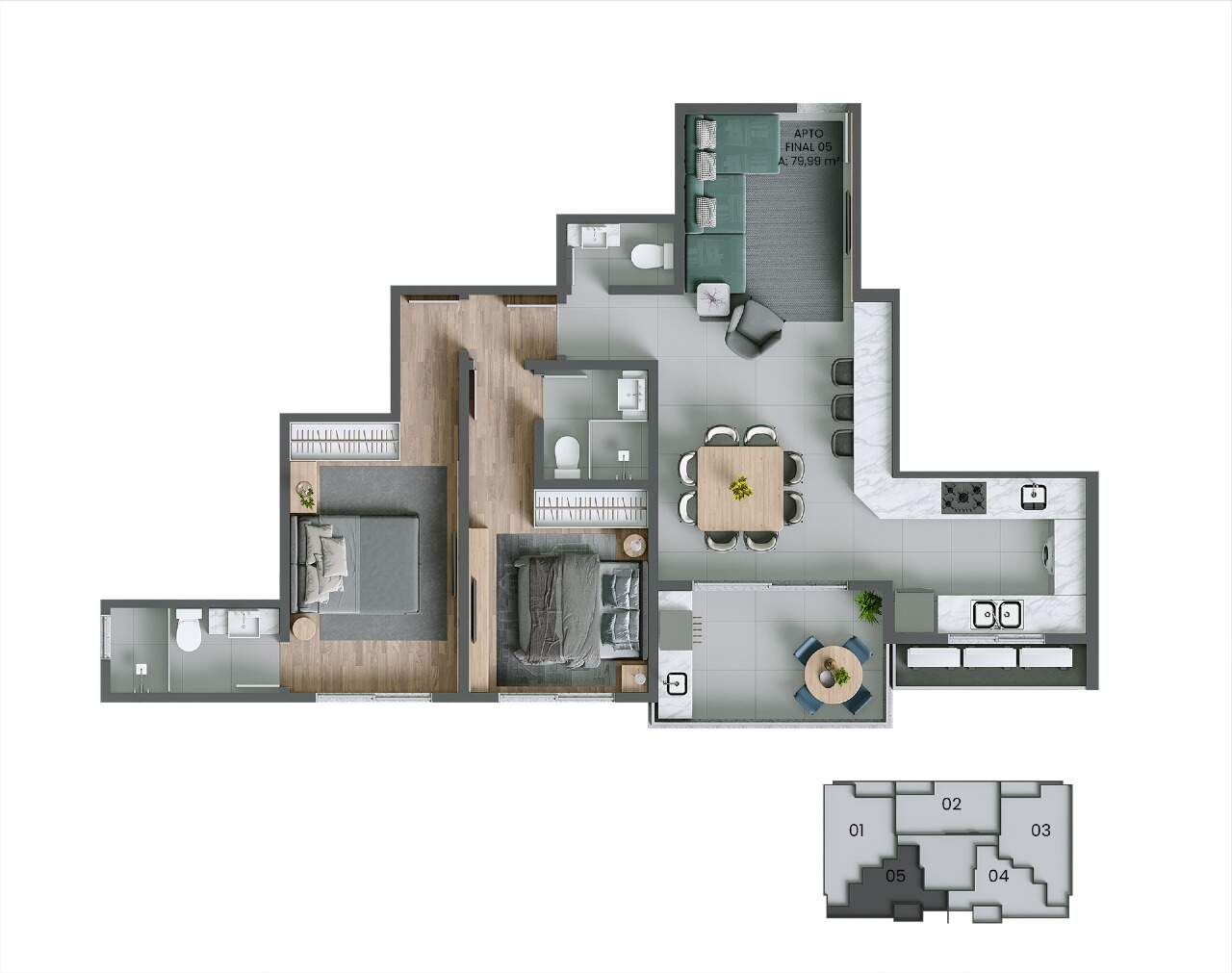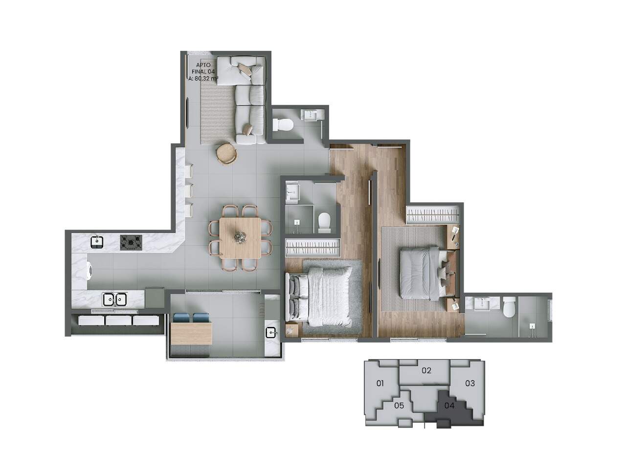 - Piso porcelanato na sala, cozinha, área de serviço, banheiros e sacada